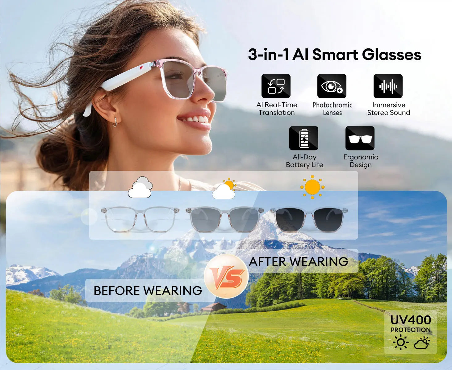 Smart AI translation audio glasses, real-time app translation in over 160 languages, light-sensitive color-changing lenses